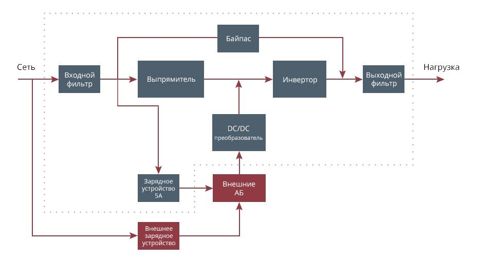 - С двойным преобразованием. Именно такие ИБП применяют в больницах, клиниках и родильных домах, поскольку они гарантируют защиту нагрузки на качественно ином уровне. В комплектацию On-Line UPS входит инвертор, аккумуляторная батарея и выпрямитель. С помощью выпрямителя переменный ток преобразуется в постоянный, а затем обратно в переменный, но уже за счет инвертора. Таким образом, создается правильная синусоида независимо от формата работы и конфигурации входного напряжения. Аккумуляторная батарея всегда подключена к цепи, что гарантирует безразрывный переход на резервное питание и стабильную поддержку заданной частоты на выходе. Современные производители выпускают On-Line модели с удобным интерфейсом управления, высокой ремонтопригодностью, повышенным коэффициентом полезного действия и легко интегрируемые с корпоративными IT-системами.